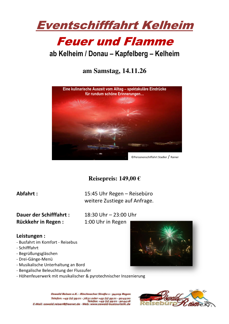 Feuer & Flamme - Schiffahrt ab Kelheim mit Musik, Menü & Feuerwerk